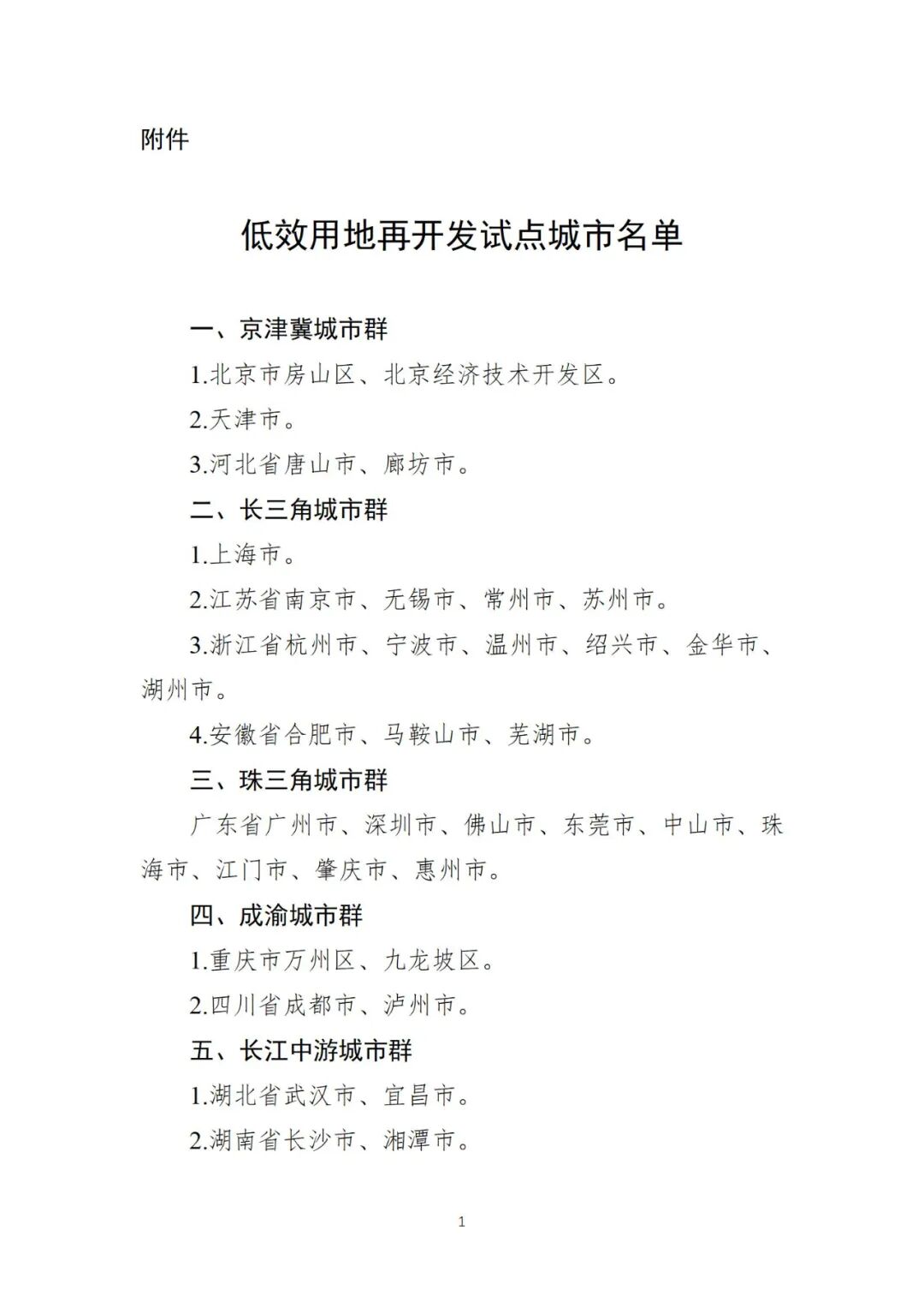 自然资源部关于开展低效用地再开发试点工作的通知北京、天津、河北、上海、江苏、浙江、安徽、福建、江西、山东、湖北、湖南、广东、重庆、四川等省(市)自然资源主管部门:长期以来,在一些城镇和乡村地区,包括城中村、老旧厂区,普遍存在存量建设用地布局散乱、利用粗放、用途不合理等问题。为贯彻党中央、国务院关于实施全面节约战略等决策部署,落实在超大特大城市积极稳步推进城中村改造的有关要求,聚焦盘活利用存量土地,提高土地利用效率,促进城乡高质量发展,部决定在北京市等43个城市开展低效用地再开发试点,探索创新政策举措,完善激励约束机制,现就有关事项通知如下。(一)指导思想。以习近平新时代中国特色社会主义思想为指导,全面贯彻党的二十大精神和全国生态环境保护大会要求,坚持最严格的耕地保护制度、最严格的节约集约用地制度和最严格的生态环境保护制度,以国土空间规划为统领,以城中村和低效工业用地改造为重点,以政策创新为支撑,推动各类低效用地再开发,推动城乡发展从增量依赖向存量挖潜转变,促进形成节约资源和保护环境的空间格局、产业结构、生产方式、生活方式。1.坚持底线思维、守正创新。严格落实国土空间规划管控要求,严守红线底线,确保耕地不减少、建设用地总量不突破、生态保护红线保持稳定。在坚持“局部试点、全面探索、封闭运行、结果可控”的前提下,探索创新盘活利用存量土地的政策机制。2.坚持有效市场、有为政府。坚持市场在资源配置中的决定性作用,更好发挥政府作用。强化政府在空间统筹、结构优化、资金平衡、组织推动等方面的作用,坚持公平公开、“净地”供应,充分调动市场参与的积极性。3.坚持补齐短板、统筹发展。坚持把盘活的城乡空间资源更多地用于民生所需和实体经济发展,补齐基础设施和公共服务设施短板,改善城乡人居环境,保障产业项目落地和转型升级。4.坚持公开透明、规范运作。强化项目全过程公开透明管理,维护市场公平公正。健全平等协商机制,充分尊重权利人意愿,妥善处理群众诉求。完善收益分享机制,促进改造成果更多更公平惠及人民群众。(三)工作目标。试点城市要通过探索创新,统筹兼顾经济、生活、生态、安全等多元需要,促进国土空间布局更合理、结构更优化、功能更完善、设施更完备;增加建设用地有效供给,大幅提高利用存量用地的比重和新上工业项目的容积率,推广应用节地技术和节地模式,明显降低单位GDP建设用地使用面积;建立可复制推广的低效用地再开发政策体系和制度机制,为促进城乡内涵式、集约型、绿色化高质量发展提供土地制度保障。总结《关于深入推进城镇低效用地再开发的指导意见(试行)》(国土资发〔2016〕147号)实践经验,针对新形势、新任务、新要求,围绕低效用地再开发政策与机制创新,重点从四个方面开展试点探索。1.加强规划统领。依据国土空间总体规划,明确低效用地再开发的重点区域,合理确定低效用地再开发空间单元。探索编制空间单元内实施层面控制性详细规划,明确土地使用、功能布局、空间结构、基础设施和公共服务设施、建筑规模指标等要求,经法定程序批准后,作为核发规划许可的法定依据。探索土地混合开发、空间复合利用、容积率奖励、跨空间单元统筹等政策,推动形成规划管控与市场激励良性互动的机制。2.突出高质量发展导向。国土空间规划应针对低效用地再开发,明确目标导向,提出规划对策,强调高质量发展导向。基于促进产业转型升级、优先保障公共服务设施和基础设施供给、保护生态和传承历史文脉,在体现宜居、人文、绿色、韧性、智慧等方面,提出空间布局优化引导对策。3.引导有序实施。试点城市应当依据国土空间总体规划和控制性详细规划,编制低效用地再开发年度实施计划,确定低效用地再开发项目并有序实施。加强全市域、分区域的规划统筹,从城市整体利益平衡出发谋划实施项目,避免过度依赖单一地块增容来实现项目资金平衡。4.完善收储机制。对需要以政府储备为主推进低效用地再开发项目实施的,结合国土空间控制性详细规划编制,探索以“统一规划、统一储备、统一开发、统一配套、统一供应”推动实施。探索将难以独立开发的零星地块,与相邻产业地块一并出具规划条件,整体供应给相邻产业项目用于增资扩产(商品住宅除外)。5.拓展收储资金渠道。统筹保障土地收储、基础设施开发建设等资金投入,做好资金平衡,合理安排开发时序,实现滚动开发、良性循环。完善国有土地收益基金制度,明确国有土地收益基金计提比例,专项用于土地储备工作。6.完善征收补偿办法。完善低效用地再开发中土地征收的具体办法,依据国土空间规划合理确定土地征收成片开发中公益性用地比例等具体要求,明确集体土地上房屋征收补偿标准和程序、依法申请强制执行情形等规定。7.探索资源资产组合供应。在特定国土空间范围内,同一使用权人需使用多个门类自然资源资产的,探索实行组合包供应,将各个门类自然资源的使用条件、开发要求、标的价值、溢价比例等纳入供应方案,通过统一的自然资源资产交易平台,一并对社会公告、签订配置合同,按职责进行监管。鼓励轨道交通、公共设施等地上地下空间综合开发节地模式,需要整体规划